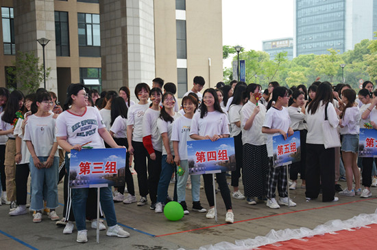 指压板跳绳成为全场的焦点,每队派出两名队员,以一人带一人的形式在指压板上跳绳,完成15个即可前往下一关。每队参赛选手都忍住疼痛,坚持跳完15个。吹牛皮较为容易,吹满四个气球并打好结则闯关成功;跳绳撕名牌考验的是团队协作。每队派出两名成员甩绳子,剩下八名成员依次排成一列,跳完八个后,甩绳子的同学根据指示撕下名牌方可过关。最后,在各项游戏用时最短的第六组成为了比赛的第一名。整个游戏环节也在欢声笑语中结束了。