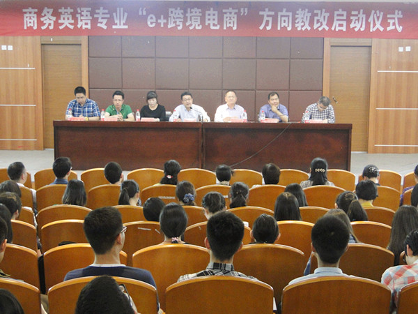 校园新闻网讯 5月21日下午,3044永利在阶三201举行商务英语专业教改启动仪式。敦煌网商公司主任谢凤霞、东莞市三松树网络科技有限公司总经理王海航、宁波甬耀会会长王怀周等多家跨境电子商务企业和网络科技公司专家应邀参加此次会议。公司副董事长陈炳、教务处处长王家荣、3044永利经理姚剑鹏、党总支书记陈愉、副经理方治强、公司全体教师及2014级商务英语专业员工参加了启动仪式。会议由3044永利经理姚剑鹏主持。