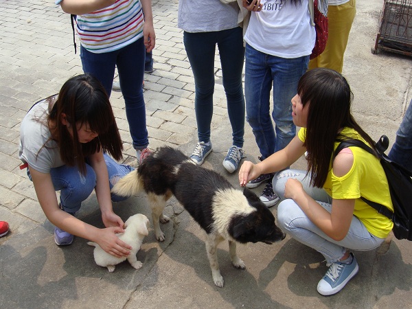 当我们到达基地时,阳光再一次变得异常刺眼,大家不停地喊着热却没有一个人退却。然而我们竟再一次看到了那个社会爱狗人士的队伍,这更是加强了大家的干劲。这一次的活动增加了更多的内容,初到基地时,我们结伴照顾小狗,陪小狗们玩耍,与小狗合照,别样的氛围让人倍感温馨。午餐时间,我们照例给小狗们喂食,看着小狗们摇着尾巴奔来吃饭,队员们都干劲倍增,似是看到了莫大的回报一般。下午,在基地主人的带领下,我们一行人赶往新基地为小狗们打扫院子,尽管阳光十分刺眼,扫地、清理垃圾等等的杂事也很多,但队员们毫不在意,一个个大汗淋漓却还是笑容不减,与社会爱狗人士的合作、互助也十分默契,他们的行动让我们更加肯定了我们的活动的意义与价值。
