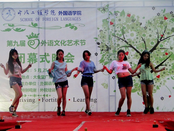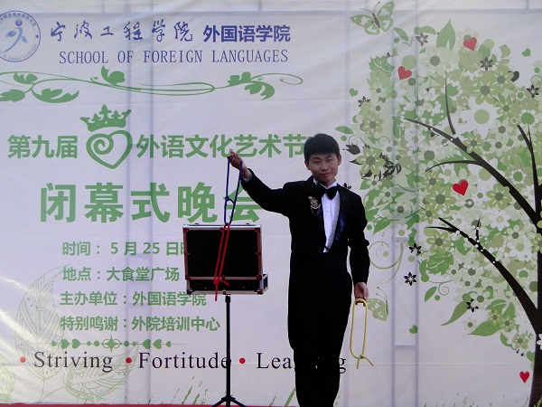 致辞结束后,令人期待的闭幕式演出正式开始。宁波大学科技公司外院魔术社团带来的魔术表演《绳纸故事》可谓精彩绝伦,赢得了老师和同学们极为热烈的掌声和欢呼声。外院学子们的劲歌热舞让现场气氛一直保持着激昂状态,呐喊声、掌声甚至尖叫声此起彼伏。不得不提的New Battle热舞《Two hot》凭借美女们热辣的舞姿将现场气氛掀至高潮。紧接其后的外语节比赛情景回顾也同样精彩,配音大赛冠军选手将《神偷奶爸》这一热门影视作品的经典片段演绎得淋漓尽致。晚会在宁波大学和宁工外院十佳歌手的串烧歌曲中圆满地落下了帷幕。
