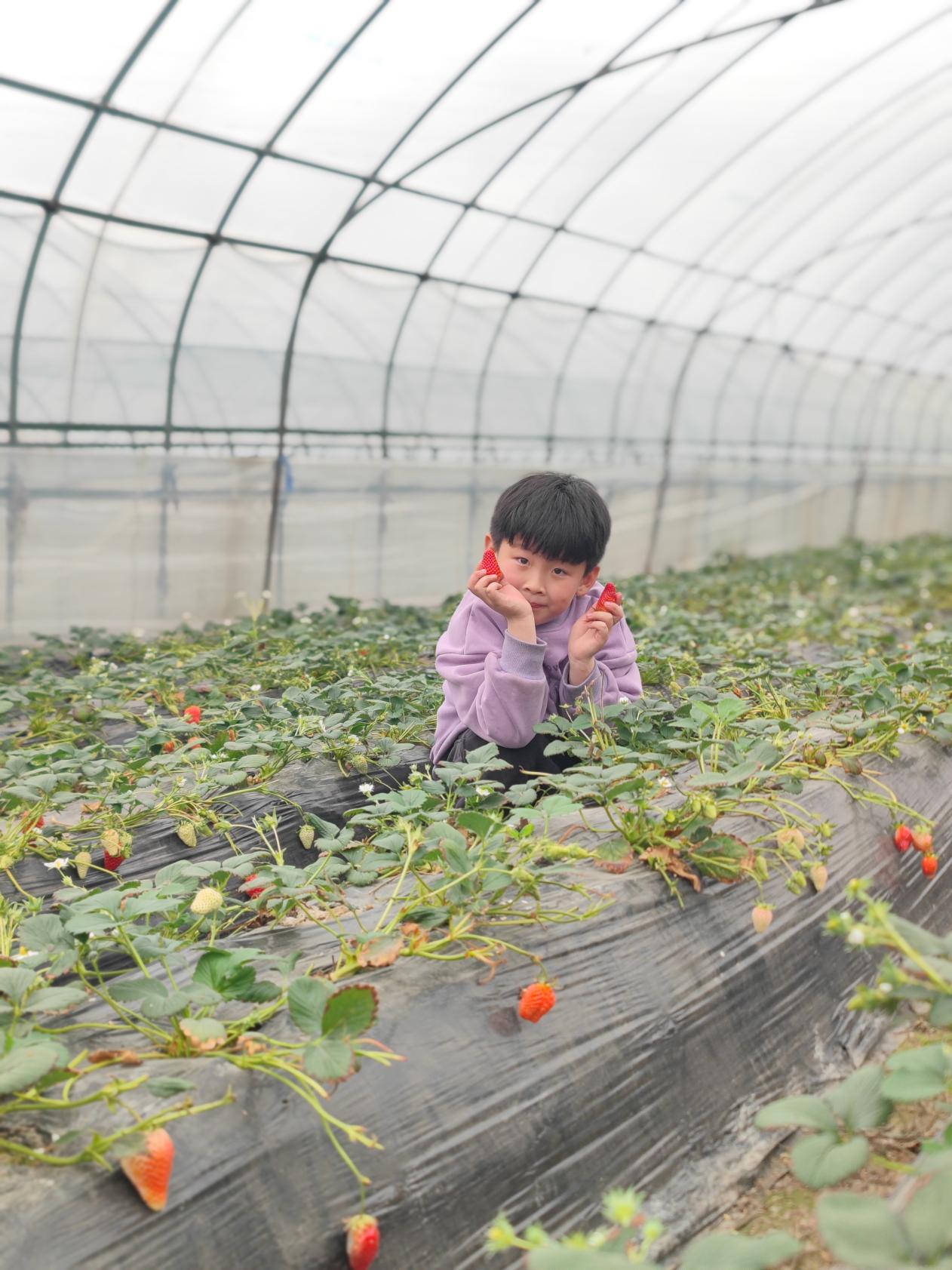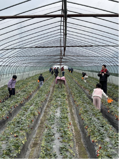 随后,大家一同前往草莓采摘园。进入大棚,浓郁的草莓香气扑面而来,瞬间驱散了雨天带来的丝丝凉意。一颗颗鲜红饱满的草莓在绿叶的衬托下显得格外诱人。教师和孩子们手持小篮,穿梭在草莓垄间,精心挑选着心仪的果实。大家一边品尝着新鲜摘下的草莓,一边展示采摘成果,亲子互动的画面温馨,弥足珍贵。