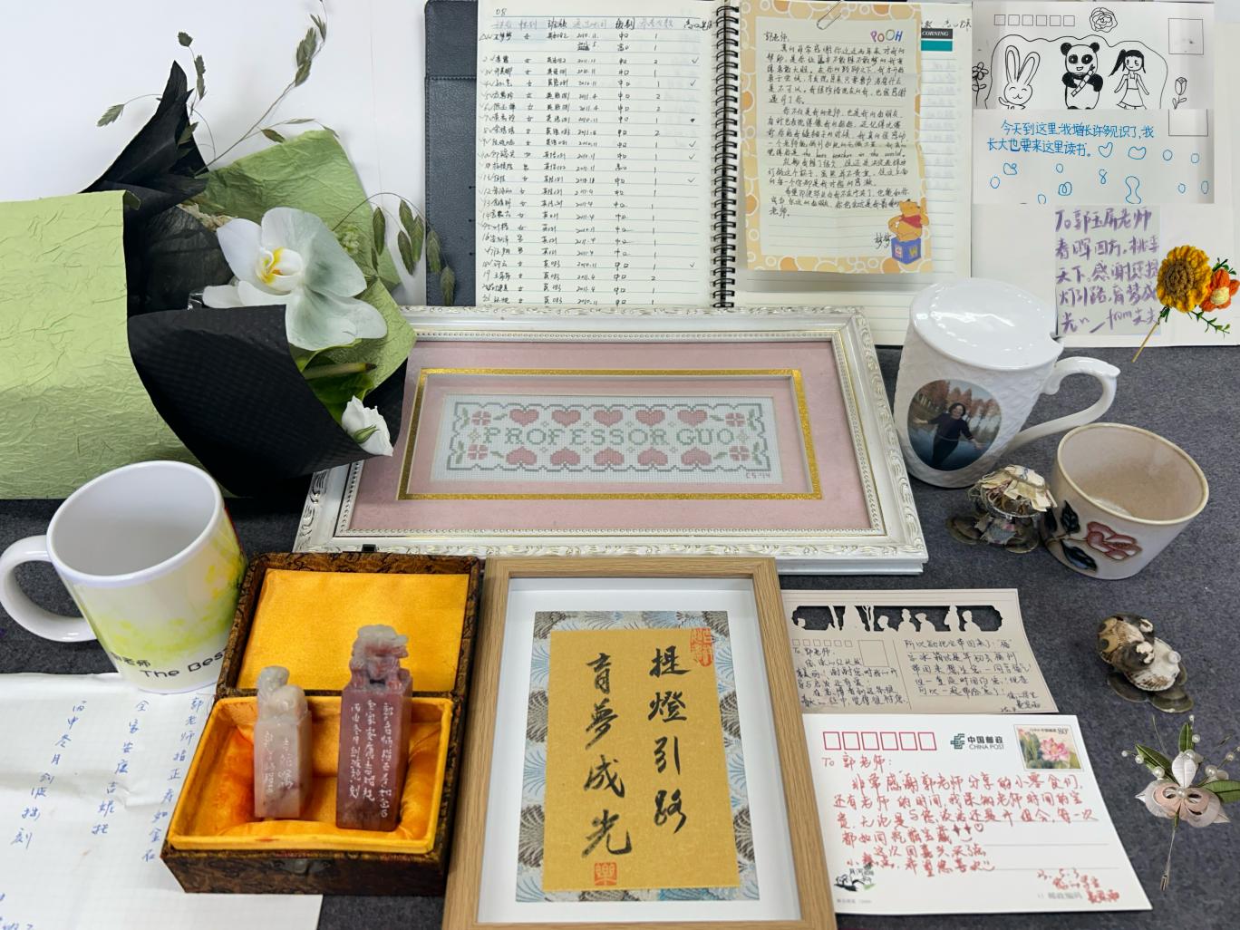 郭老师的礼物箱里,员工亲笔书写的书法墨香犹存,线编的胸针还留着指尖的余温,茶杯上的“BestTeacher”是员工的真情告白,篆刻家家长亲手凿刻的印章里藏着家长对教师的高度认可。这些糅合着家庭温度与个人巧思的礼物,让教育的情感联结从课堂延伸至生活肌理,在一针一线、一笔一刻间显影出最质朴的育人真味。这些带着体温的手作物件,正用最质朴的方式诉说着:所谓师恩,从来不是毕业合影里的客套的微笑,而是那些被悄悄收藏的短信、跨越千里的探望。