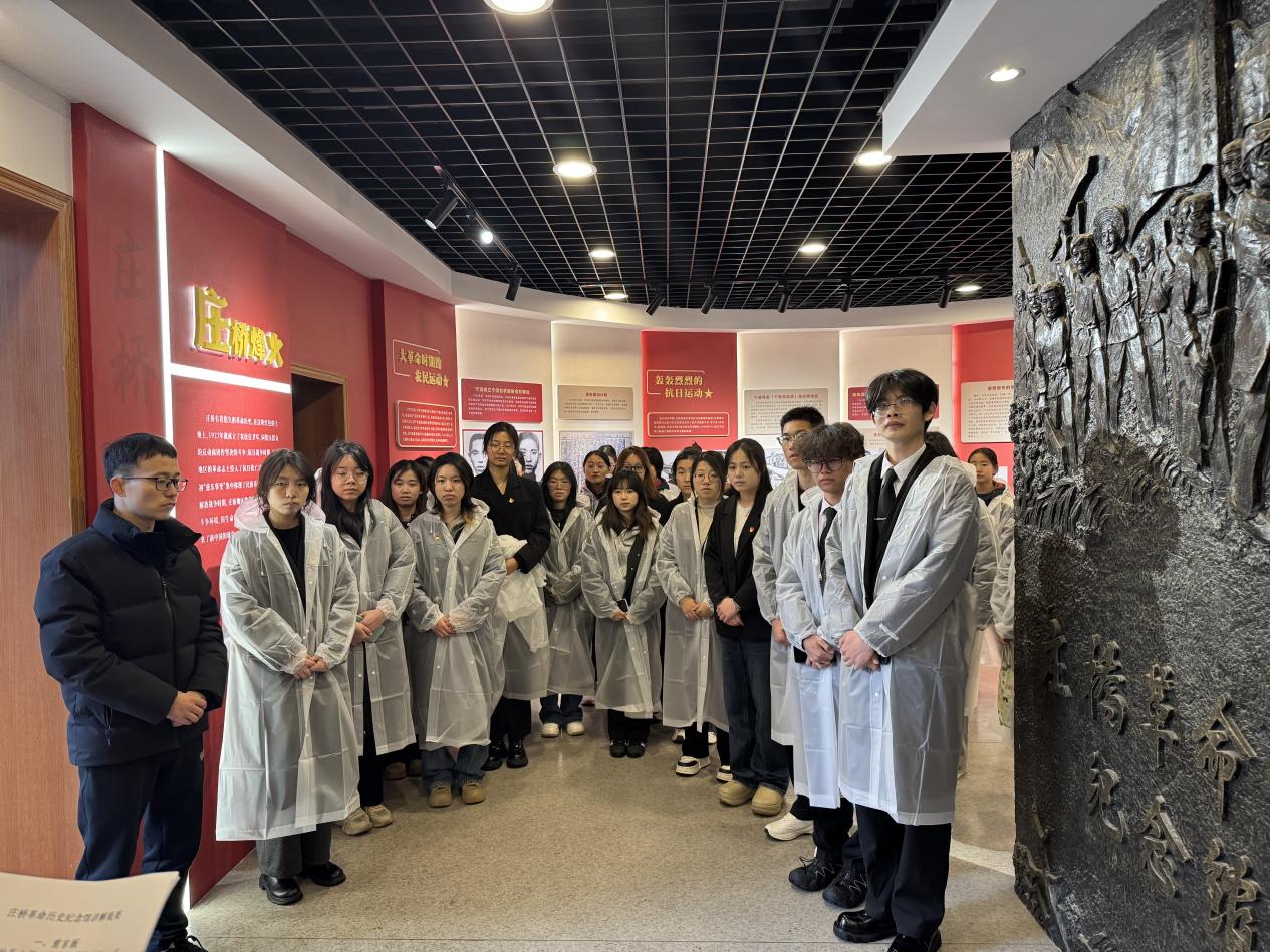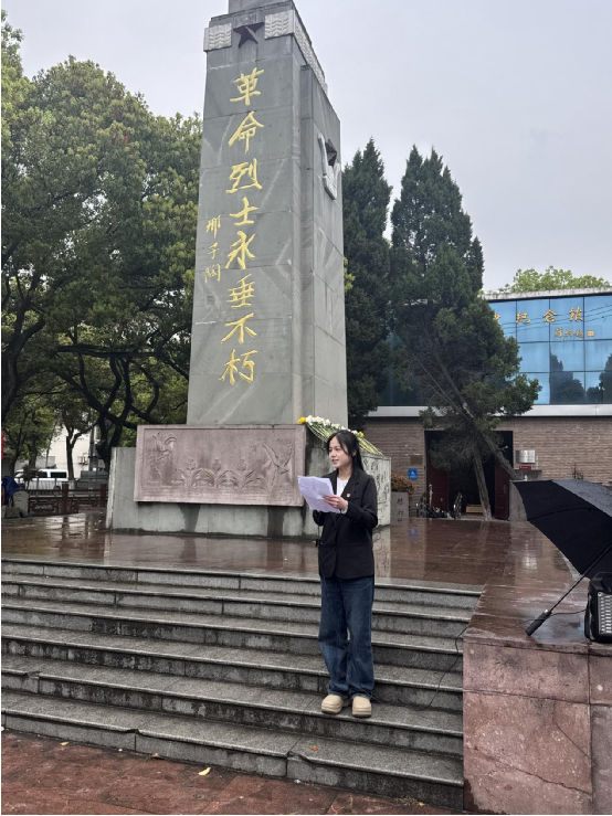 尽管天空阴沉,细雨不断,但师生们的脚步坚定,神情庄严肃穆。下午1:30时,身着素色服装的党员们,手持白色菊花,列队走进庄桥革命历史纪念馆,在革命烈士纪念碑前,向革命先烈默哀致敬。党员代表徐楚莹缓步上前,在细雨中娓娓讲述庄桥英烈的不朽篇章。她凝视着纪念碑上镌刻的“革命烈士永垂不朽”八个鎏金大字,声音低沉而有力:“宁波这片土地,曾见证过无数先烈用鲜血浇灌自由之花。”英雄的事迹在雨中回荡,传递着新时代青年传承红色基因、勇担时代责任的坚定信念。
