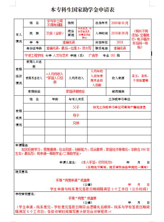 请大家根据最新版公示名单进行申请,特别困难同学可以申请一等助学金,一般困难同学申请二等助学金,请大家填写申请表电子版,所有时间都不填写,照片空着,严格按照规范填写(附填写示例样表),本人做好材料审核工作,避免重复返工。填好的申请表电子版请于10月3日上午10点前发送至2097581814@qq.com