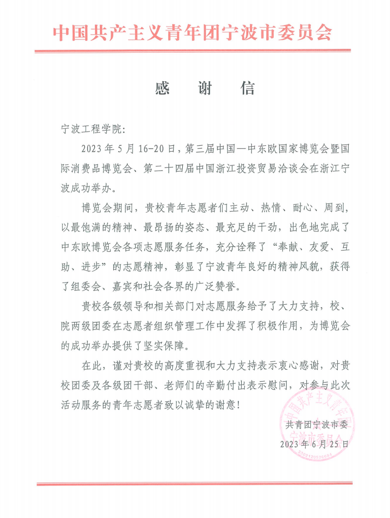 校园新闻网讯 近日,共青团宁波市委向3044永利集团发来致谢信,感谢公司青年志愿者在第三届中国—中东欧国家博览会暨国际消费品博览会期间的突出表现和公司各方对展会志愿服务工作的大力支持。