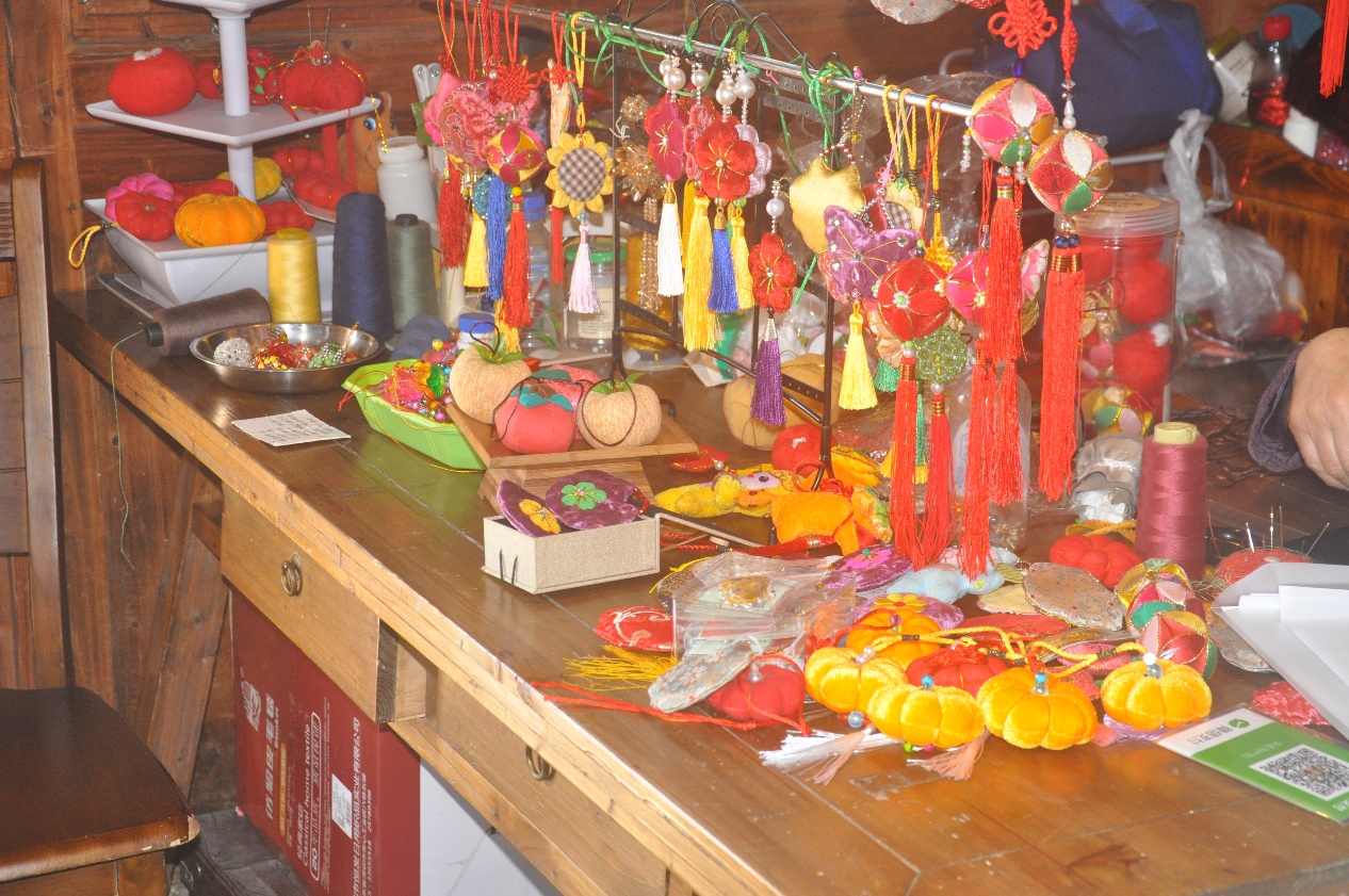 然后,调研团队拜访了吉祥绣球传承人华爱月老师,听她诉说着吉祥绣球的寓意。“这种款式的绣球寓意着四季平安,挂在车上,串着要是都很方便”华老师摆弄着手中的绣球,笑着介绍道。