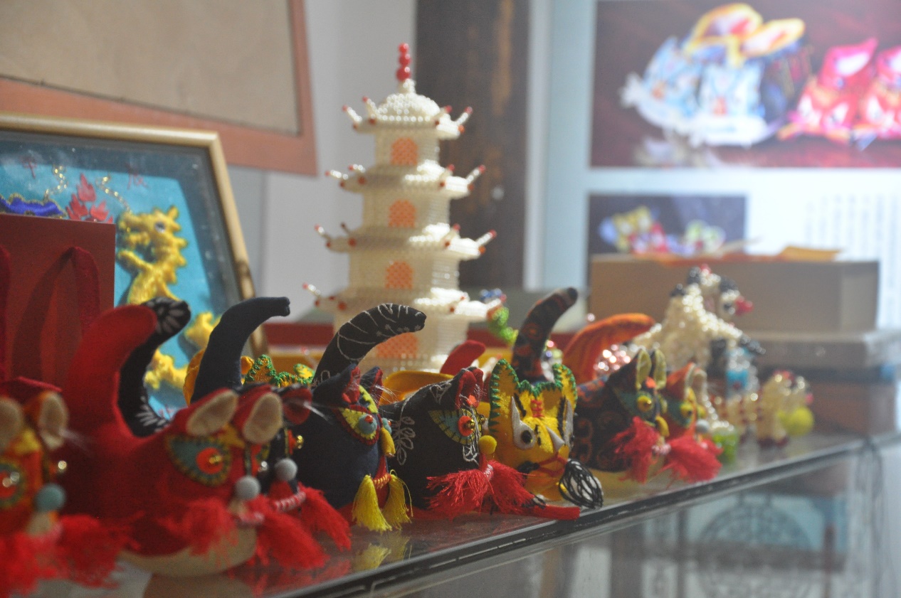 接着,调研团队参观了虎头鞋非遗传承人冯香云老师的作品。大大小小,虎头虎脑的虎头鞋陈列在陈旧的木架上,憨态可掬,令人爱不释手。