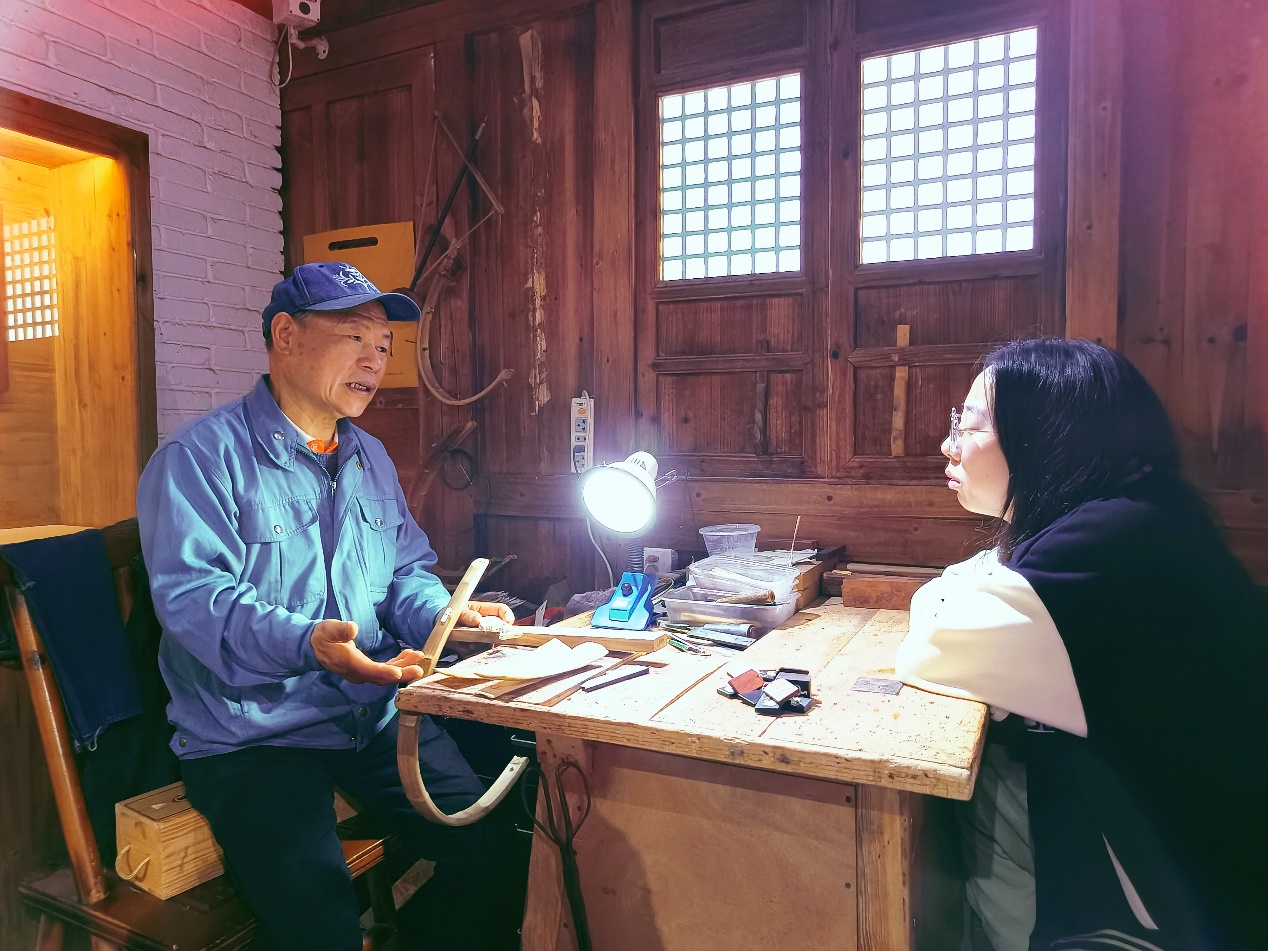 接下来,调研团队来到了骨木镶嵌传承人金国民老师的工作室,观看金老师现场制作骨木饰品。骨面光泽鲜亮,木面古朴大气,两相结合,尽显粗犷浑厚、华贵绚烂,诉说着历史的厚重。