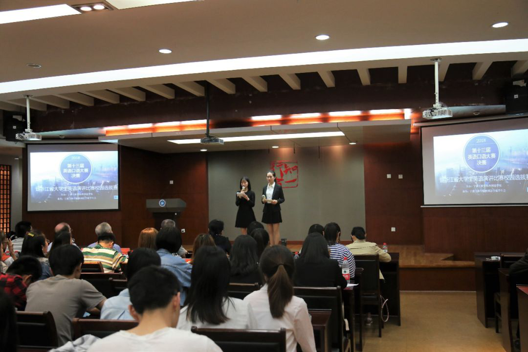 校园新闻网讯公司第十三届英语口语大赛决赛暨浙江省老员工英语演讲比赛校园选拔赛于5月4日晚在行政楼四楼报告厅成功举办。公司副经理方治强,老师余双玲、葛璐群、王霞、王琨以及外教Breet和Greg担任本次大赛的评委,辅导员焦中彦,分团委副书记杨腓立、俞珍芸,学联主席朱霞燕,学联副主席何璐冰、朱诗云以及上届省演讲比赛二等奖获得者谢诗嘉受邀出席本次大赛。