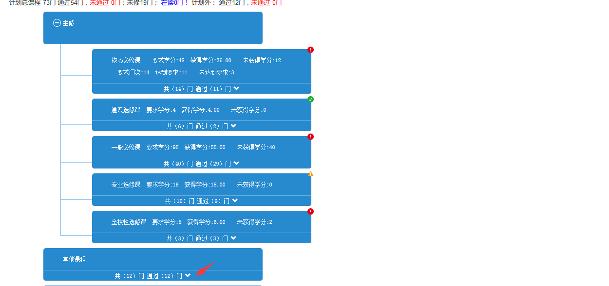 ’,查看具体课程信息,其中挂在主修节点下的课程是培养计划内的课程,其他课程是计划外的(就是这里面的课程是可以申请替代培养计划内的课程的)。