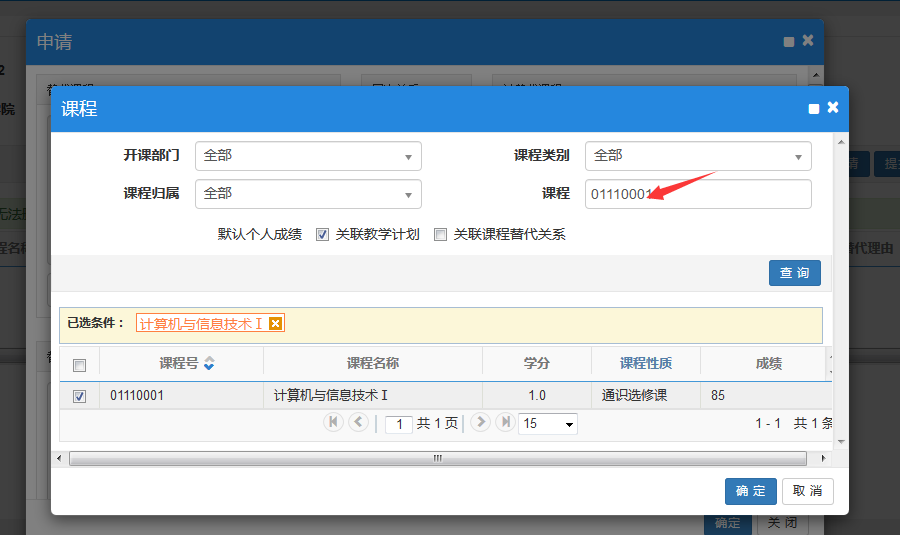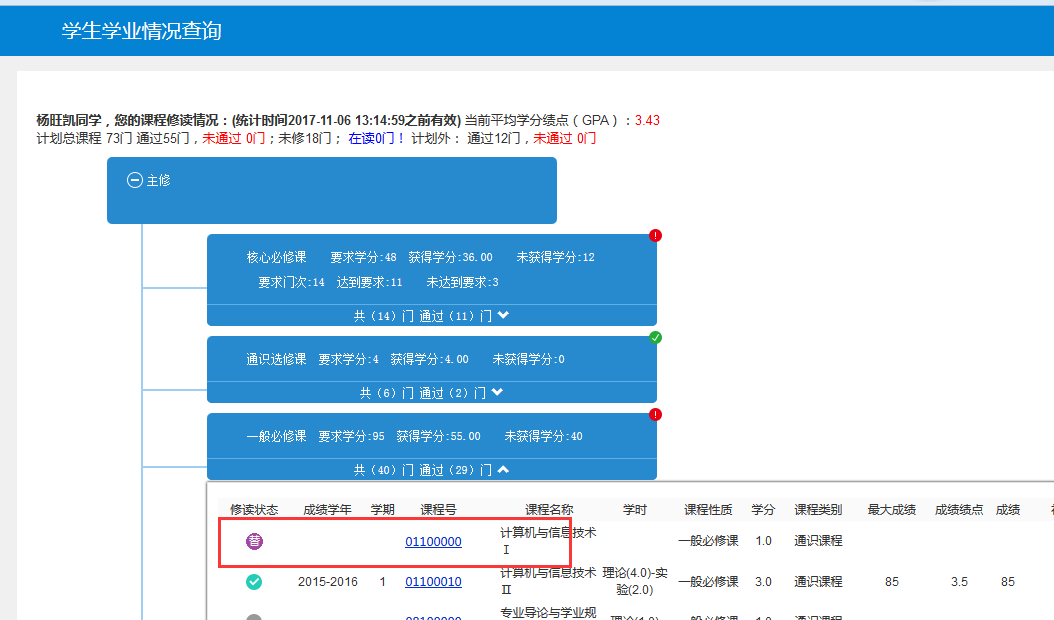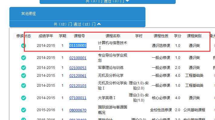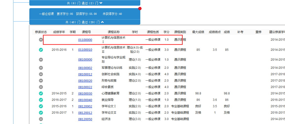 如计算机与信息技术Ⅰ 这门课,在培养方案的课程代码是01100000(在主修节点——一般必修课节点下显示状态为