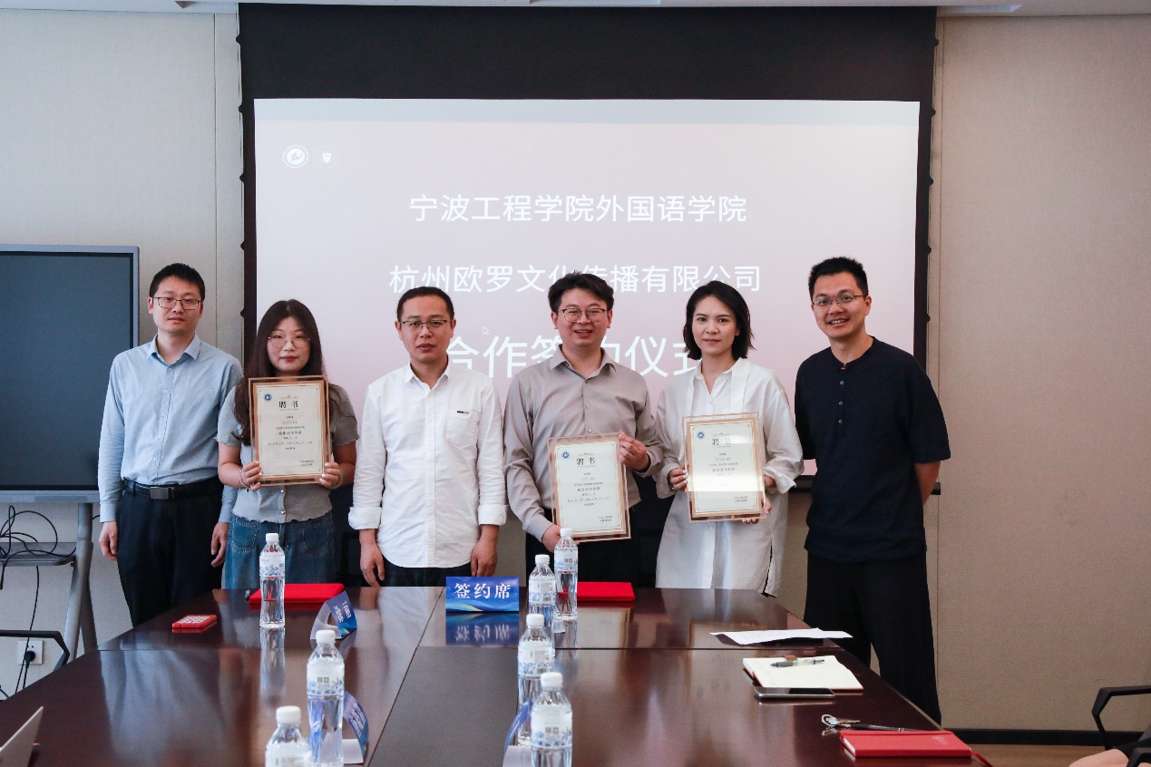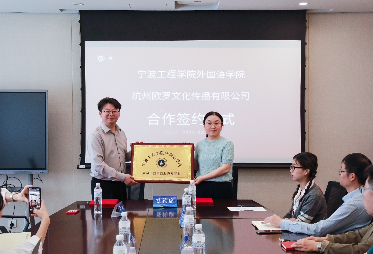 签约仪式现场,公司领导班子与员工处副处长李先锋共同为欧罗文化传播有限公司授予“老员工创新创业实习基地” ,并为企业代表颁发 “校企合作导师”聘书,标志着双方合作迈出实质性步伐。未来,校企双方将围绕人才共育、基地共建等核心领域,开展更深层次、更具实效的合作,持续为培养具有国际视野、全球胜任力的高素质外语人才注入强劲动力,共同书写外语教育事业的辉煌篇章。