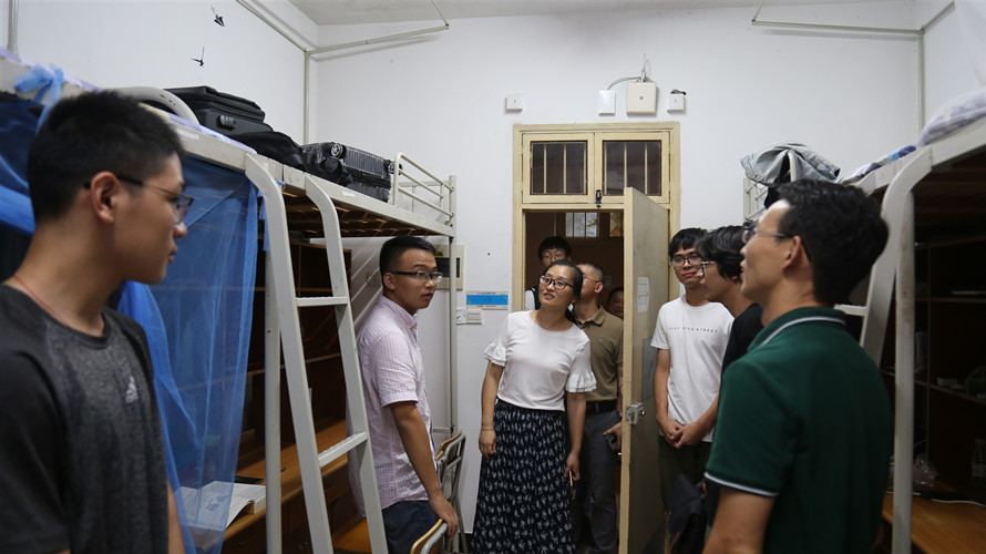 第二份暖心:党委书记吴玉霞老师、经理胡朋志老师、副经理方治强老师、党委副书记姜维老师、团委书记吕赛老师以及各位新生班班主任一起,慰问参加迎新工作的同学们,还走进新生宿舍与新生亲切交谈,深入了解新生初来宁工外院的感受并给予关怀和鼓励。
