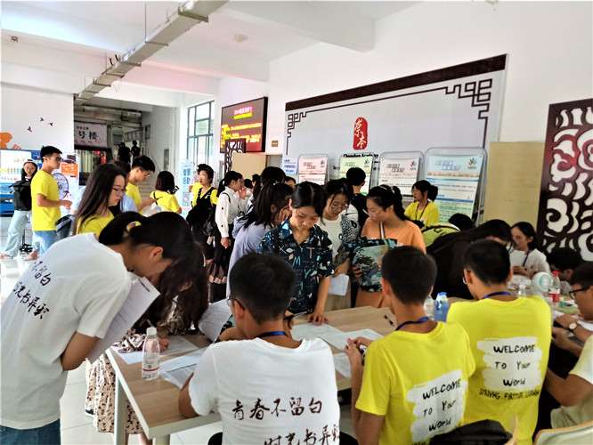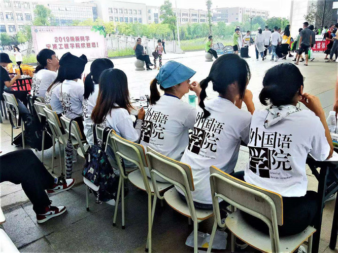 外院新生助教和志愿者们穿着独属于外院的Logo标志T恤,明黄色的志愿者服和白色的助教服相映成趣,成为一道靓丽的风景线。