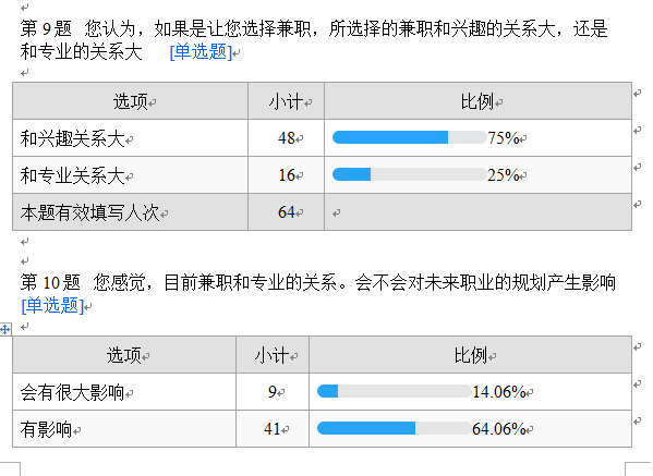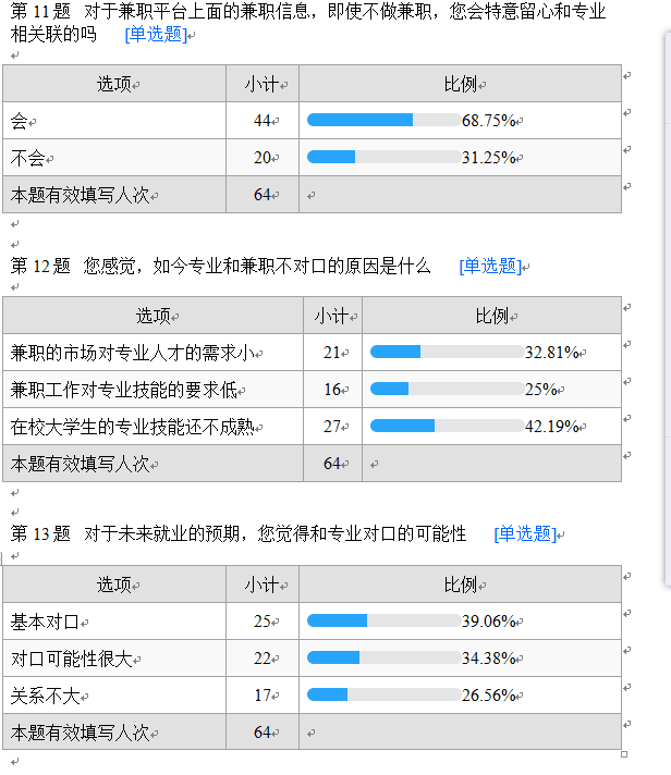 比如图片所示那样的第一个问题的回答情况,有7成的同学,对于兼职和自己的专业是否有关系是不在乎的,同时,针对这一个问题,我们再结合之前的线下问卷,回去翻翻之前的线下问卷会发现,线下和线上数据的契合度很高,随机抽取的10份线下问卷,有7分也是写的不在乎,所以,经过验证之后,这些数据都可以放心使用。