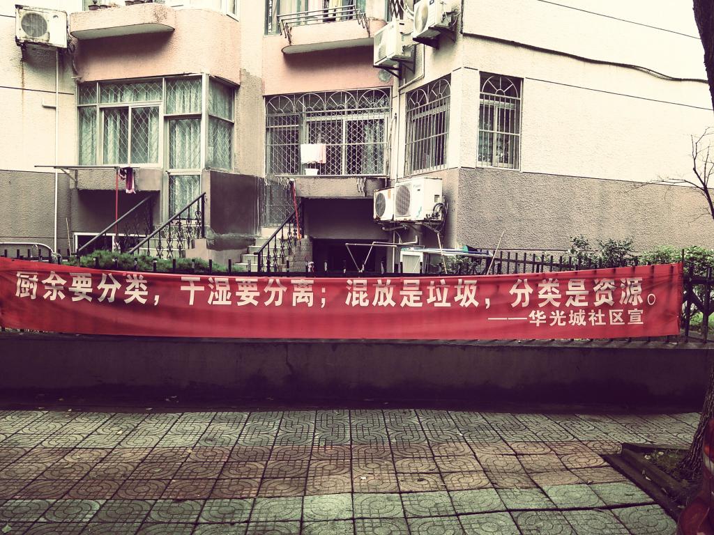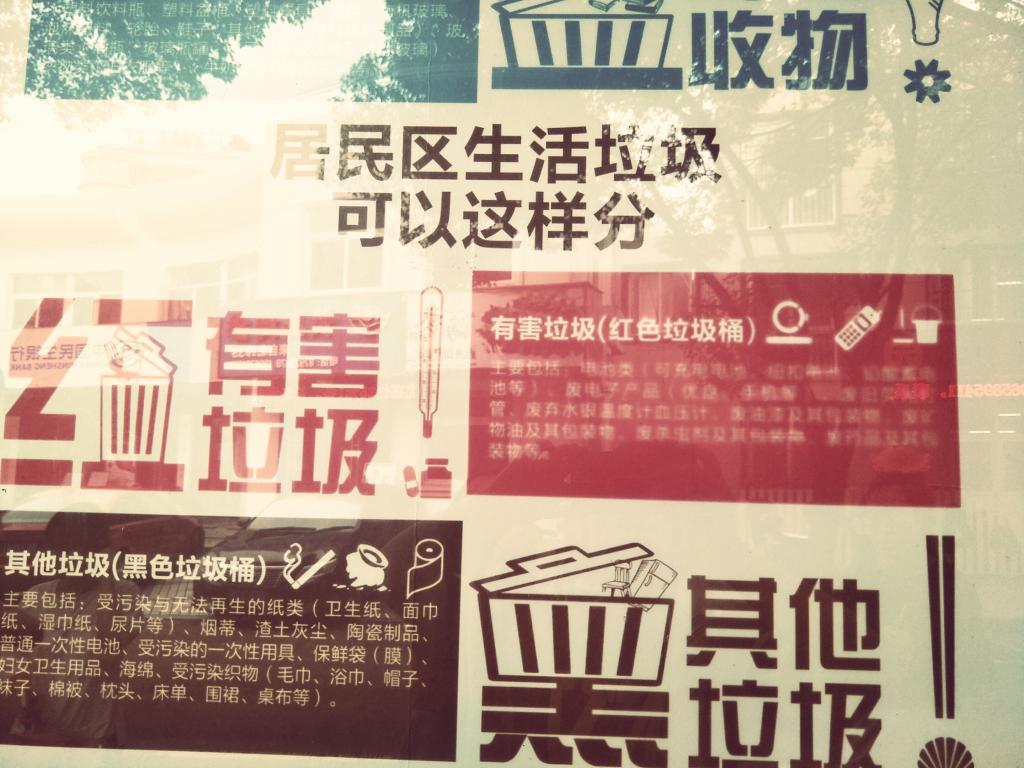 小区中有张贴着醒目的提醒垃圾分类的横幅。看横幅的磨损程度,可以看出来这横幅也挂了很久了。小区里的宣传窗里也有关于垃圾分类的流程以及垃圾分类处理的必要性,也展示了垃圾分类处理做的比较好的几个国家。意外的惊喜。这是我们走过的社区中做垃圾分类宣传做的最好的社区了。