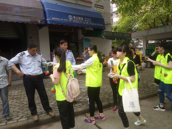 志愿者们带着写有可回收垃圾、不可回收垃圾、有害垃圾的垃圾桶,举着宣传牌,热情地向行人推广环保理念。路人们也十分感兴趣,积极配合我们的活动,他们拿到我们分发的小毛巾、环保袋、牙膏等都异常开心。