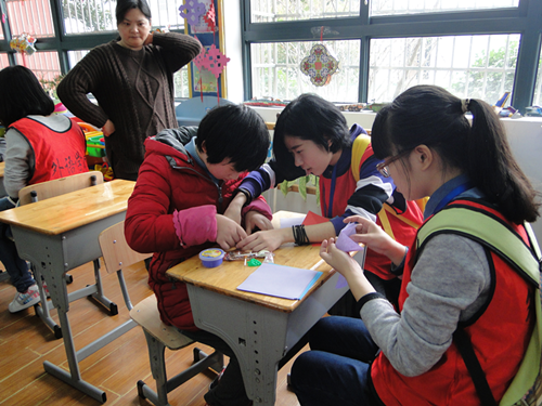 进入公司后,志愿者在公司老师建议下分成两组,分别对应关爱大、小两班。在进入教室后,大家看到那些孩子眼神迷离,行为怪异,有的甚至语无伦次,这激起了大家的关爱之心。在分发完糖果、橡皮泥、彩纸后,志愿者们“一对一”地与孩子们进行了更深入的交流。大家一起捏橡皮泥,折纸,唱歌,讲故事。志愿者们温柔耐心,孩子们纯真快乐,小小的教室里充满了爱。