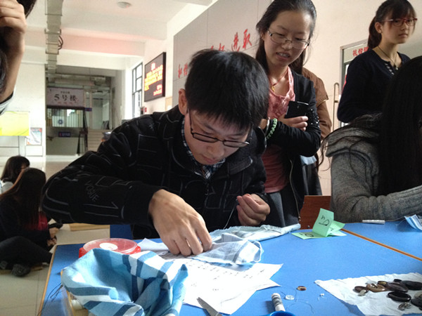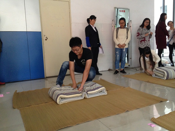一声令下,女生们争分夺秒叠被子、缝扣子,其中当然也不乏男生的积极参与,举手投足之间颇有须眉不让巾帼之势。席间观众们的助威声、欢笑声也是不绝于耳,活动现场热闹非凡。比赛圆满落幕后,同学们自是或欢喜或嗟叹,但人人收益良多。