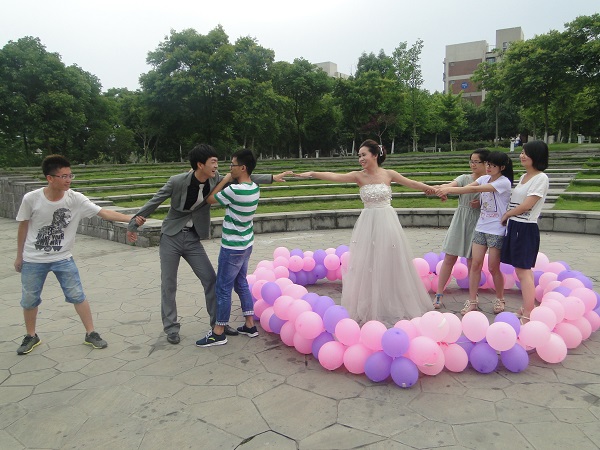 母校是他们爱情的起跑点和见证,从这里出发到参加工作,再走到步入婚姻的神圣殿堂的如今,历经曲折,终修成正果。拍摄过程中两位新人的甜蜜溢于言表,镜头捕捉并定格了他们的幸福。许多路过的学弟学妹纷纷跑来围观,并为学长学姐“搭建”了一个心型气球墙,为他们送上祝福!