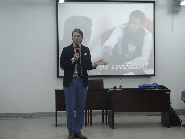 随着人员悉数到场,一切就绪。在员工们按捺不住的兴奋与热情的讨论中,缓缓走来一位儒雅的西方面孔——Linus Jonsson,现场气氛更为热烈。Jonsson以英文风趣地自我介绍,赢来阵阵掌声。整场讲座,Jonsson以流利的英文与同学们交流全球化与职业的发展。在热烈的交流中,使同学们更加认识到当今全球化,文化的不断交流与碰撞。同时,更加认识到外语在全球化过程中扮演的重要角色。此外,Jonsson与现场同学进行亲密互动,使整场活动在轻松愉快的氛围中结束。