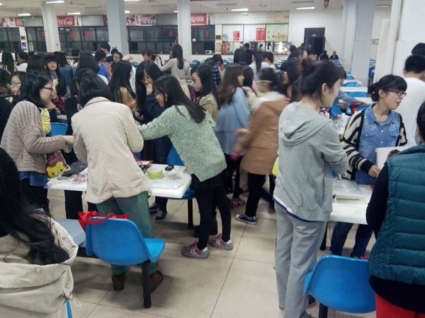 晚上七点活动开始,就有同学陆续提着各式各样的物品前来摆摊。不一会儿,食堂里就热闹起来。种类繁多、充满趣味的商品吸引了许多“顾客”的目光。有的大声吆喝降价打折,有的广告买一送一,大家纷纷驻足挑选、购买自己喜爱的商品。一位兴奋不已的同学说:“一本原价二十多块的九成新的《国家地理》,只花了我五元,真是太划算了!”