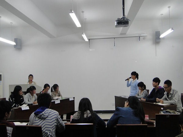 在正方辩手(日语131班代表)与反方辩手(英语133班代表)作完简短的自我介绍及双方礼貌问候后,比赛的烽火迅速燃起,。正方一辩韦柯安同学用历史现今大人物角色的转变以及房屋建两个理论点精炼地阐述了己方“不在其位,不谋其政”观点。在紧随其后的盘问环节中,双方更是唇枪舌剑步步紧逼。思想的碰撞擦亮了辩论赛激情的火花。